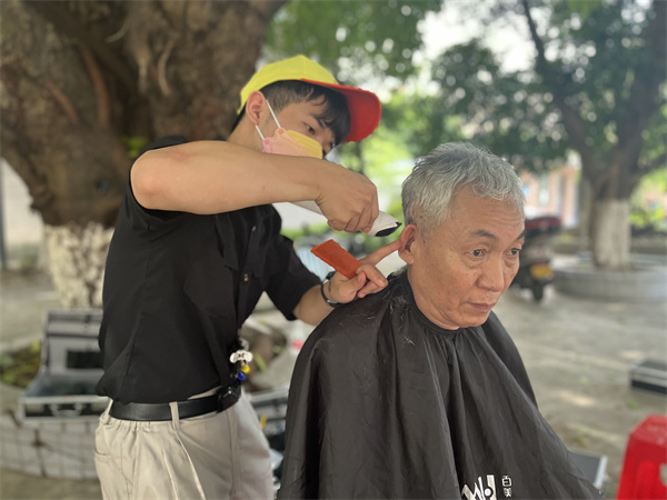 义剪过程中,学生们有条不紊地为老兵们剪发,轻柔地帮他们梳理头发,用简单的工具,专业的手法拿着推子认真理发的同时还跟老兵们聊聊家常,关心他们的身体状况等,逗得老兵们哈哈大笑。在欢快的聊天中,学生们用娴熟精湛的技术让老兵们都换上清爽舒适的新发型,对学生们的手艺赞不绝口,纷纷竖起大拇指,还贴心嘱咐着下次再来军区坐坐喝喝茶呢。