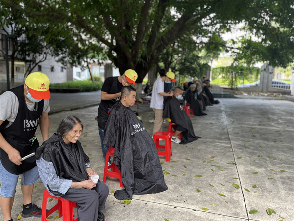 同学们整装待发早早地来到白云区兵房雅苑,摆好座椅,放置好理发用具,做好各项准备工作等待老兵们的到来。义剪开始,老兵们依次排好队坐下,整个活动现场井然有序,学生们温柔耐心地根据每个老兵的需求为他们量身打造合适的发型。